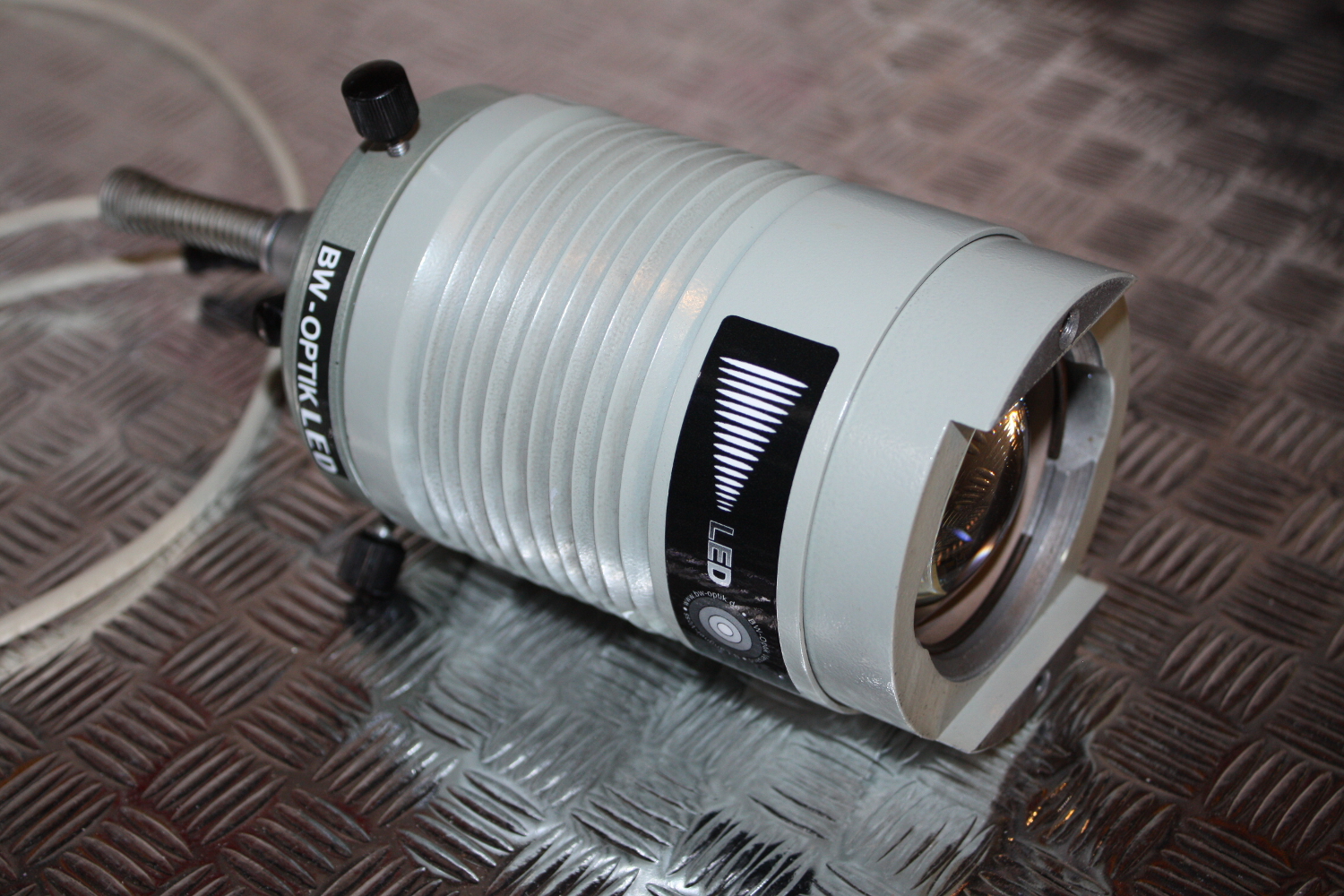 LED Mikroskopbeleuchtung Einbau für Zeiss Jena großes Meßmikroskop. Der Einbau der LED Mikroskopbeleuchtung in Ihr Lampengehäuse erfolgt in unserem Hause. Zum Einsenden sprechen Sie bitte einen Termin mit uns ab. Für Fragen steht Ihnen unser Techniker Herr Voss telefonisch zur Verfügung unter Telefon Deutschland: 04962 996484. Die LED mit Tageslichtspektrum 6000 Kelvin ersetzt den 6 Volt / 30 Watt Glühkörper, der von der Lichtintenstät und den vielen Beleuchtugsbaugruppen leider sehr unzureichend war. Die Intensität unseres ausgewählten LED Emitters ist einer 100 Watt Halogenbeleuchtung inso fern überlegen, da dieser durch Konversions- und Wärmeschutzfilter ca. 40% seiner Ursprungsintensität bei 3300 Kelvin einbüsst. Unsere LED hingegen entspricht mit 6000 Kelvin der vollen Beleuchtungsintensität. Der Anwender bei diesem Mikroskop musste sogar für seine Meßaufgaben die Beleuchtungsstärke minimieren. Also, rüsten Sie dieses große aufwendig gefertigte Zeiss Jena Meßmikroskop auf die zukuftsweisende LED Technologie um.